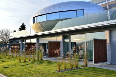 • Panorama-Außenpool mit Sonnenschirmen und Liegestühlen