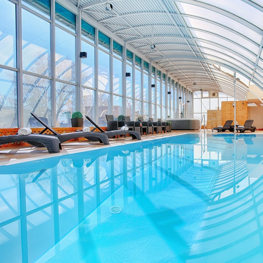 - Hallenbad (5×10 m, Temperatur 29 °C)