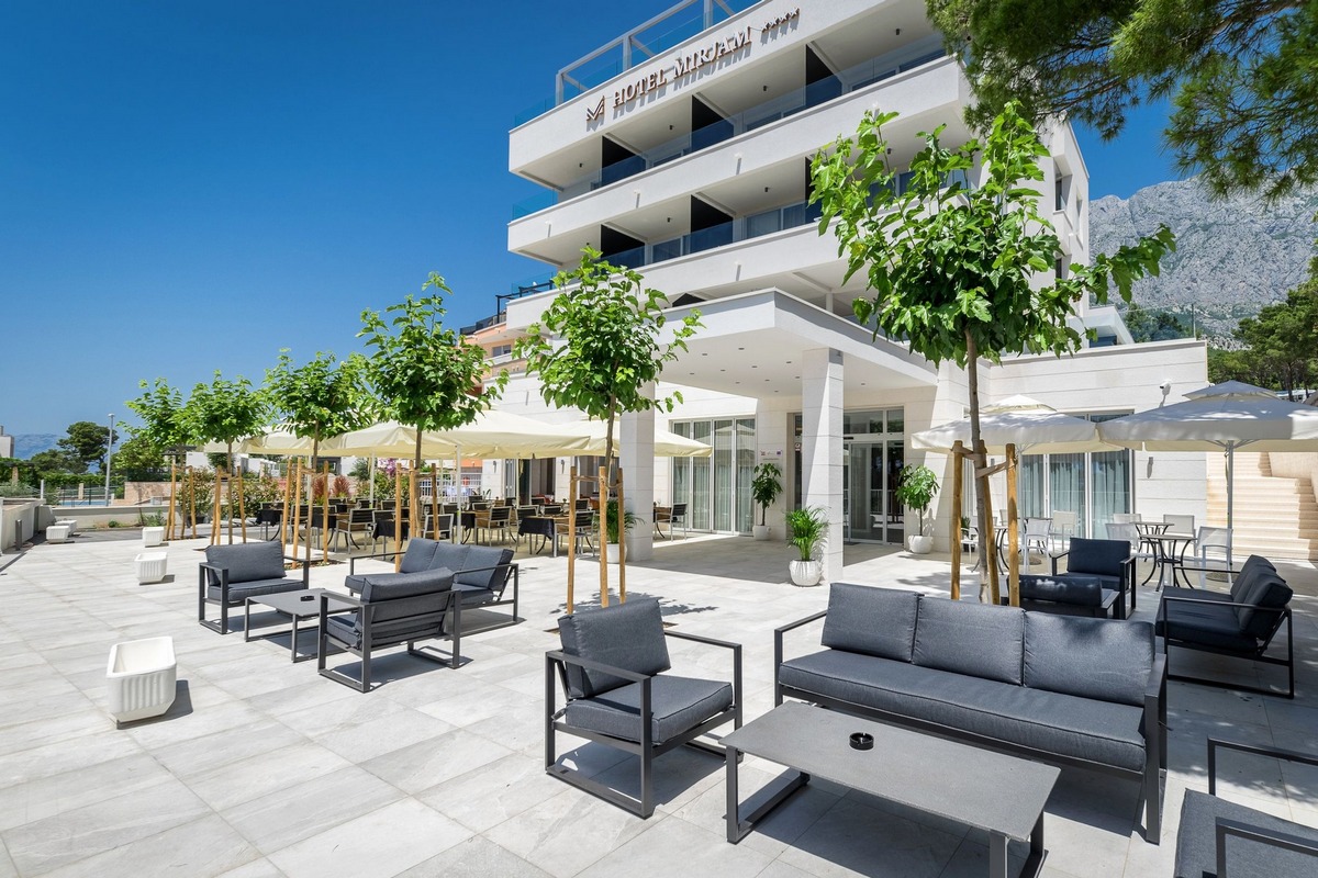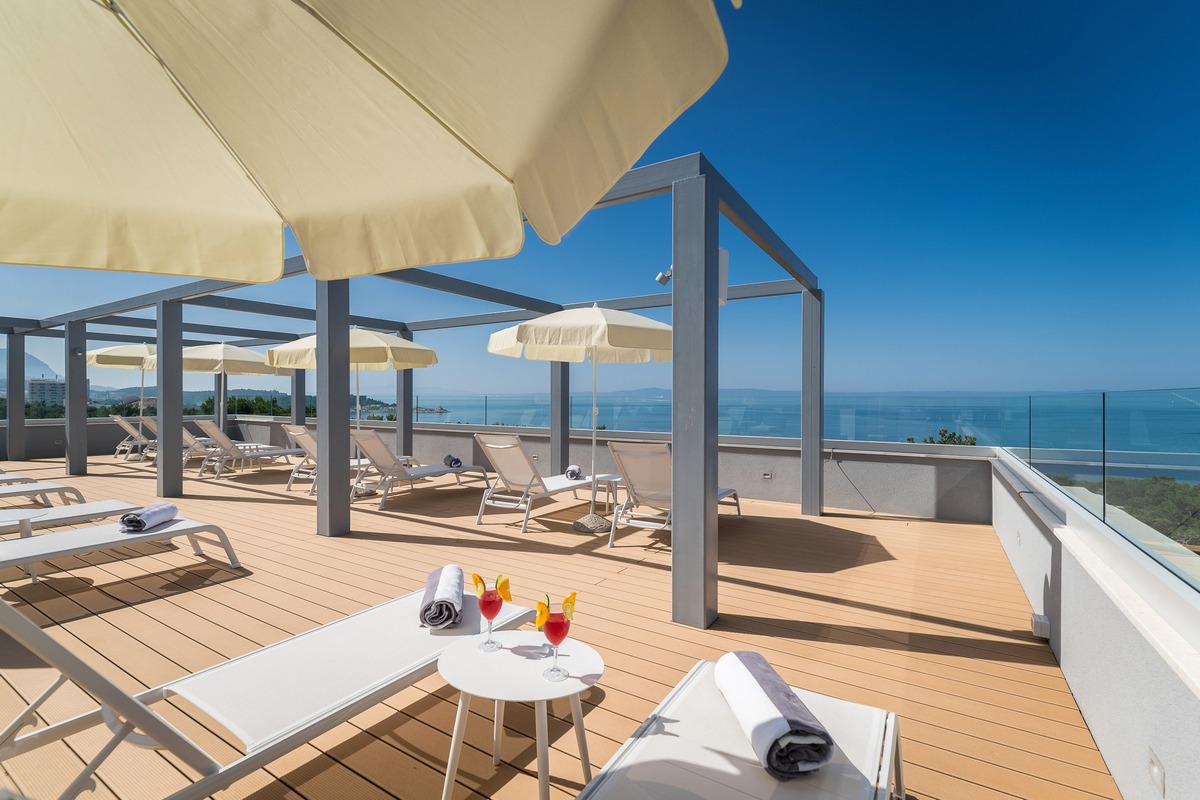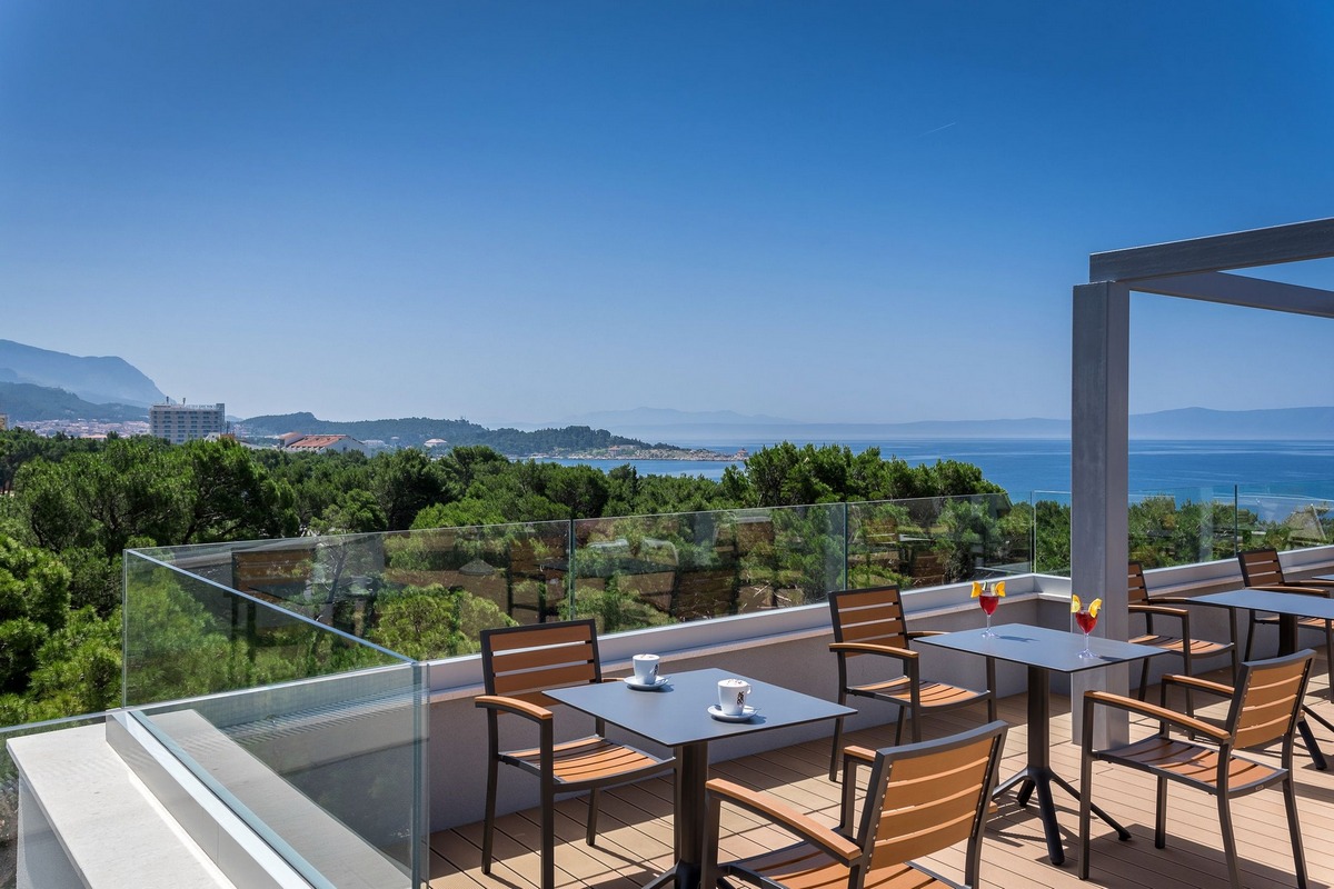 Das Hotel liegt in der Nähe eines Pinienwaldes an der Makarska Riviera, nur 150 Meter vom Meer entfernt. Der Flughafen Brač ist 35 km entfernt, das Zentrum von Makarska 3,5 km und der beeindruckende Karstsee namens Der Blaue See (kroatisch Modro Jezero) in der Nähe des Dorfes Imotski liegt etwa 37 km entfernt. Neben Sonnenbaden und Schwimmen können Sie Tennis spielen oder den nahegelegenen Naturpark Biokovo mit seinem vielfältigen Freizeitangebot nutzen. Das Hotel verfügt über luxuriöse Zimmer mit Meer- oder Bergblick, einen Souvenirshop, einen Weinkeller, einen Konferenzraum, ein Fitnesscenter, einen Dachpool und ein voll ausgestattetes Wellnesscenter.