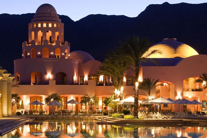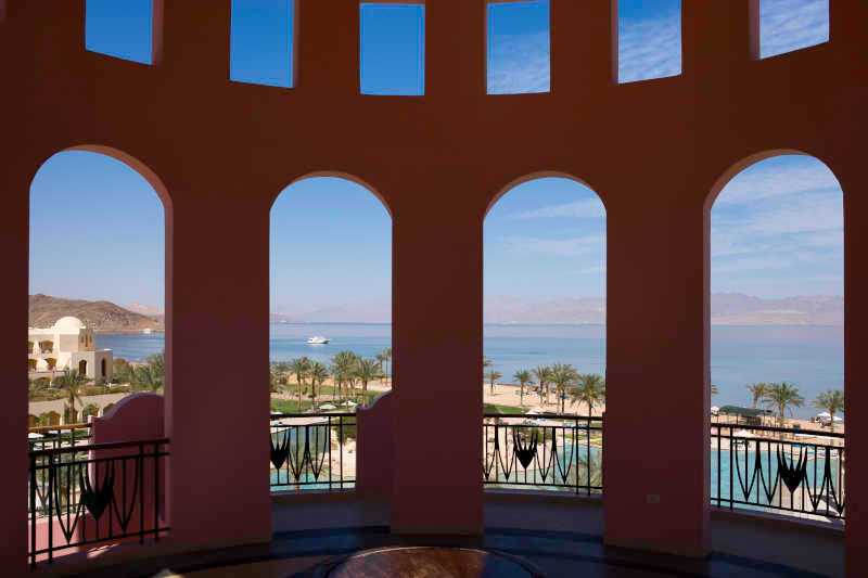 Dieser luxuriöse Hotelkomplex befindet sich in Taba, Ägypten. Von der Lobbyterrasse aus können Gäste die Aussicht auf die malerische Küste des Roten Meeres und die Grenzen Jordaniens, Israels und Saudi-Arabiens in der Ferne bewundern. Das Resort bietet eine Vielzahl luxuriöser Zimmer – von Zimmern mit Meerblick bis hin zu Präsidentensuiten. Das Resort verfügt auch über den höchsten Punkt von Taba Heights – einen gewölbten Turm, der auf die orientalische Umgebung des Hotels verweist. Hier können Sie die kunstvollen Kuppeln, Bögen und Säulen des Resorts sowie die beruhigende lachsbeige Fassade bewundern.
