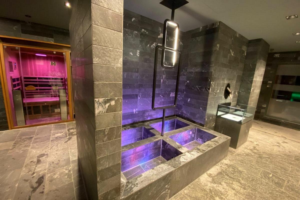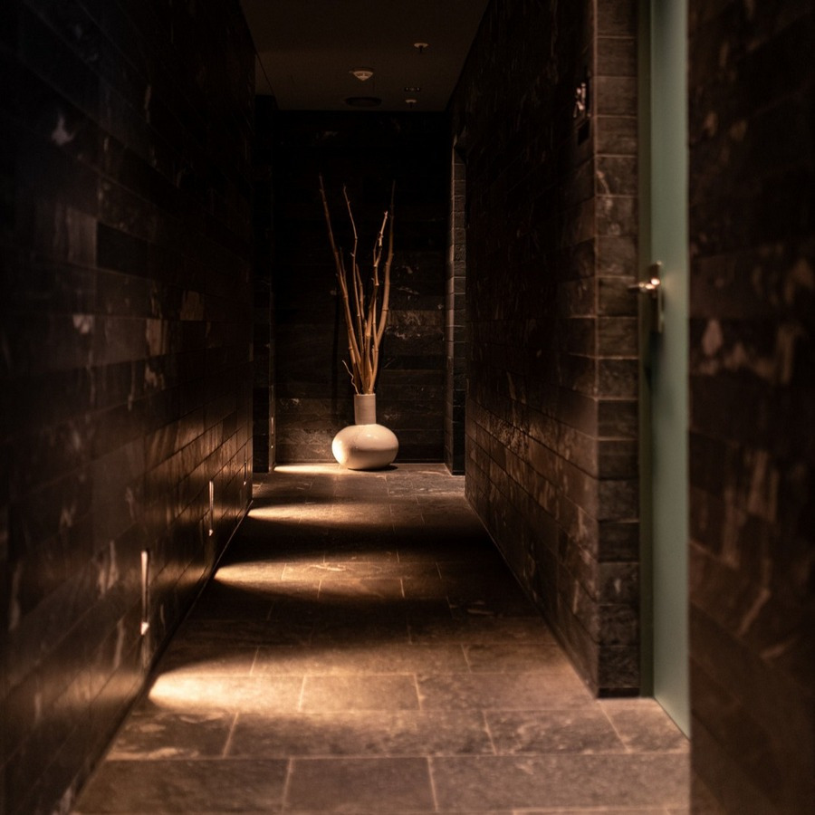 - Sanft beleuchteter Ruheraum aus Stein und schönen Fliesen