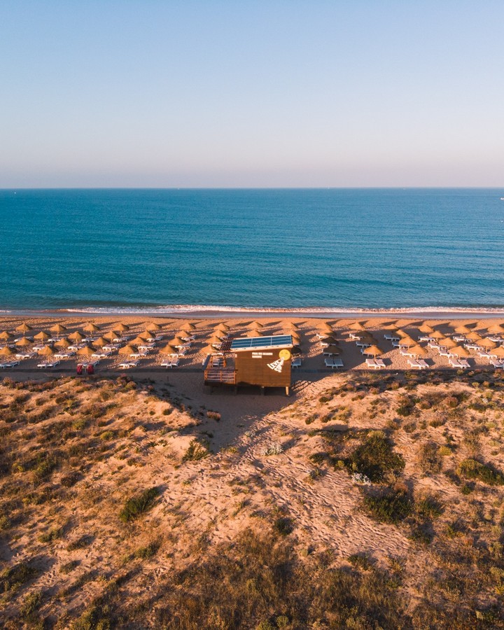 - Privatstrand (Zugang über Stufen von einem Holzsteg), Sonnenliegen mit Sonnenschirmen