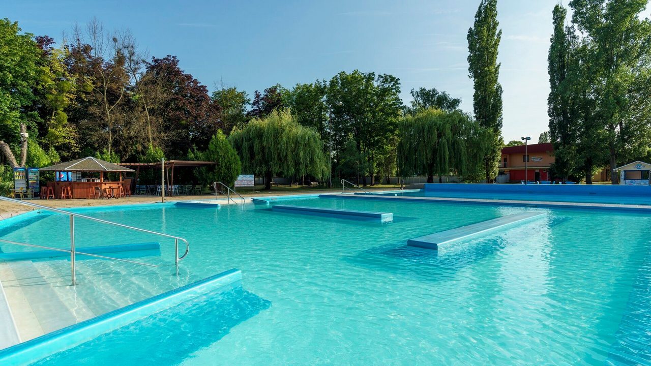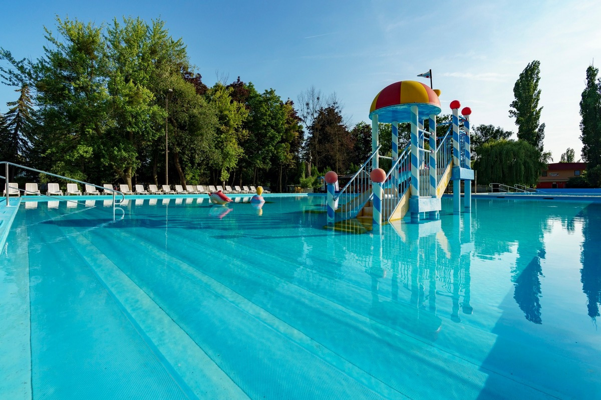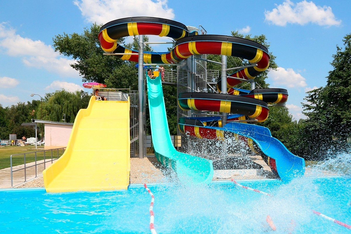 - Saisonale Außenpools (großes Schwimmbad, Becken mit Wasserrutschen, Kinderbecken mit Rutsche)